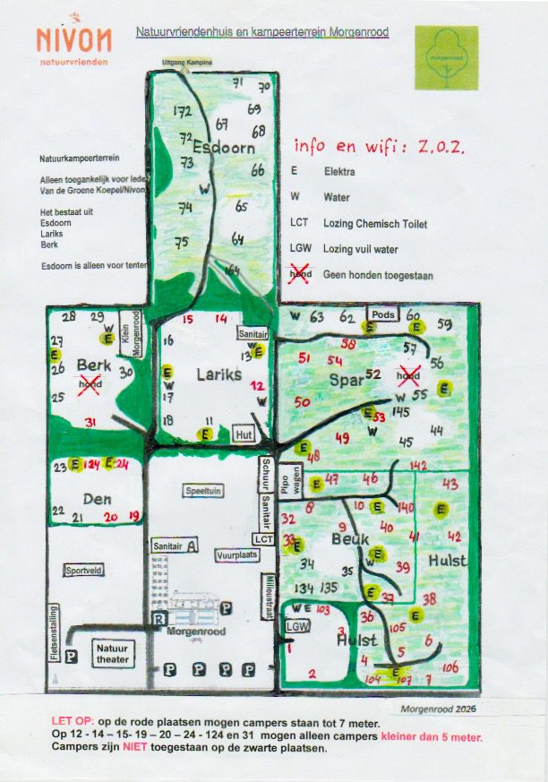 Het kampeerterrein van Morgenrood ligt in het bos en bestaat uit twee delen: één voor alle kampeerders en één voor leden van Nivon of voor Natuurkampeerders met een geldige Natuurkampeerkaart (Het Groene Boekje).
